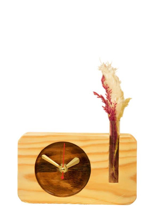 ساعت چوبی رومیزی ترکیبی با ساعتی آرامگرد با امکان قرار دادن یک لوله آزمایش برای قراردادن یک گل و استفاده از چوب فنلاندی وارداتی با نقوش بسیار زیبا و سطحی بسیار صیقلی با القای حسی لذتبخش یک محصول چوبی زیبا و دکوری مناسب برای استفاده بر روی انواع قفسه های دکوری و کتابخانه، میز تحریر یا هر فضای دلخواه دیگر بوده که با کیفیتی بالا و سطحی صیقلی تولید شده و زیبایی بخش محیط زندگی شما میباشد.