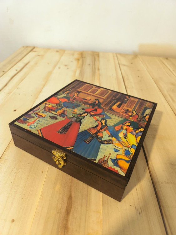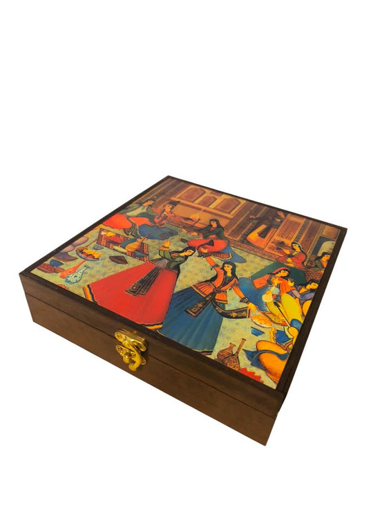 این جعبه دارای طرح و نقوش ایرانی میباشد و کلیه طرح ها چاپ مستقیم روی چوب میباشد.