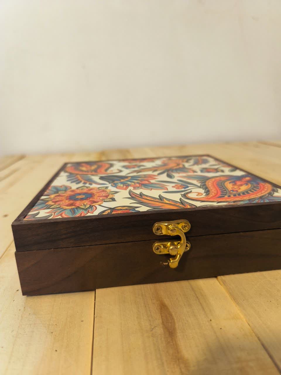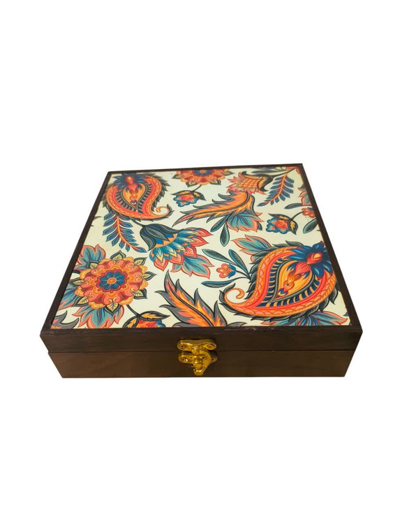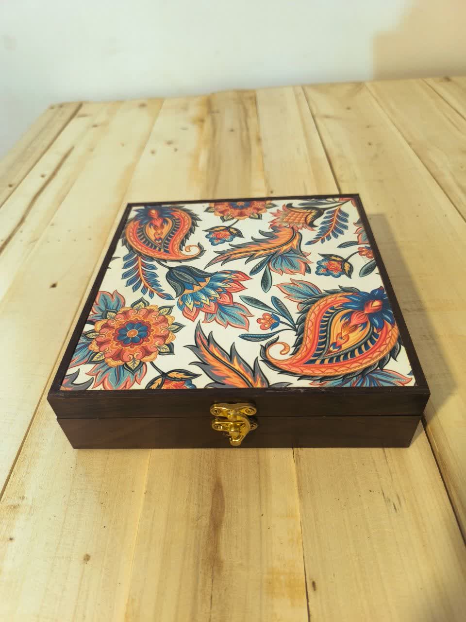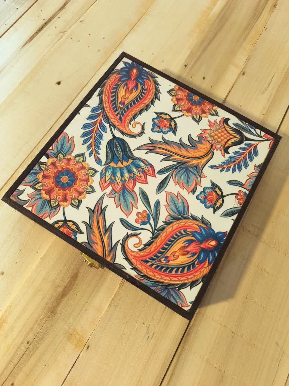 💠 *جعبه دمنوش و تنقلات طرح بته جقه قفل طلایی چاپ مستقیم روی چوب*