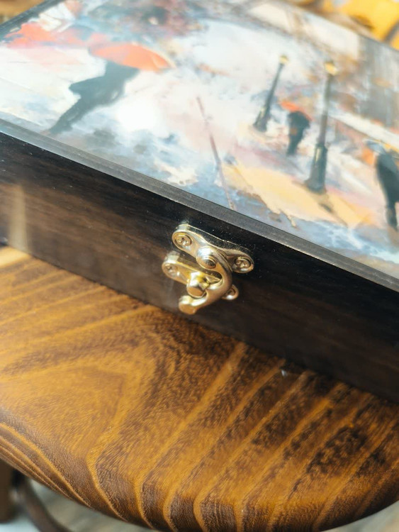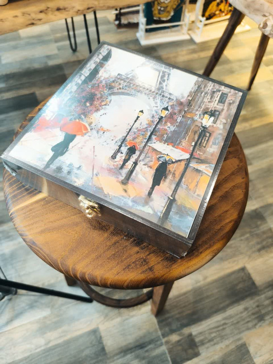💠 *جعبه دمنوش و تنقلات طرح پاریس قفل طلایی چوب دولایه چاپ مستقیم روی چوب*
