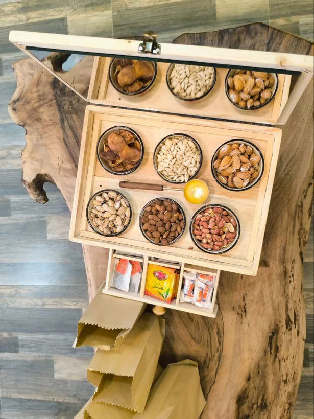 جعبه دمنوش وخشکبار لوکس توسط استادکاران نجارحرفه ای با بهترین کیفیت ممکن ساخته شده است