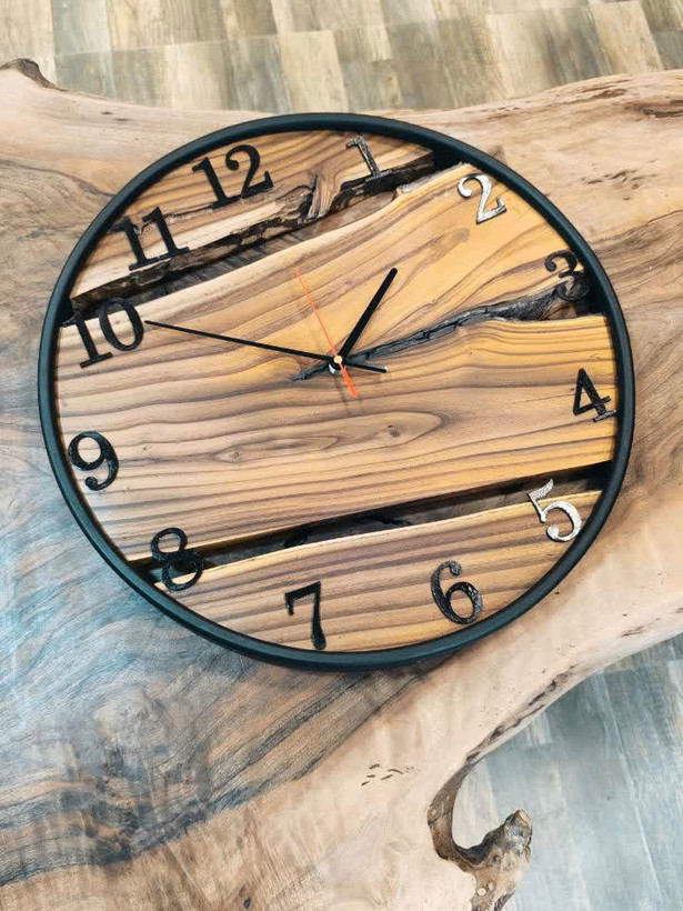 صفحه ساعت از چوب سنجد طبیعی ساخته شده و اعداد لاتین مشکی روی آن به زیبایی نمایش داده شدهاند.