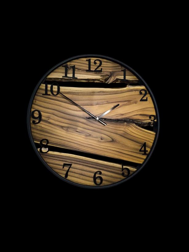 صفحه ساعت از چوب سنجد طبیعی ساخته شده و اعداد لاتین مشکی روی آن به زیبایی نمایش داده شدهاند.
