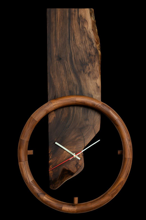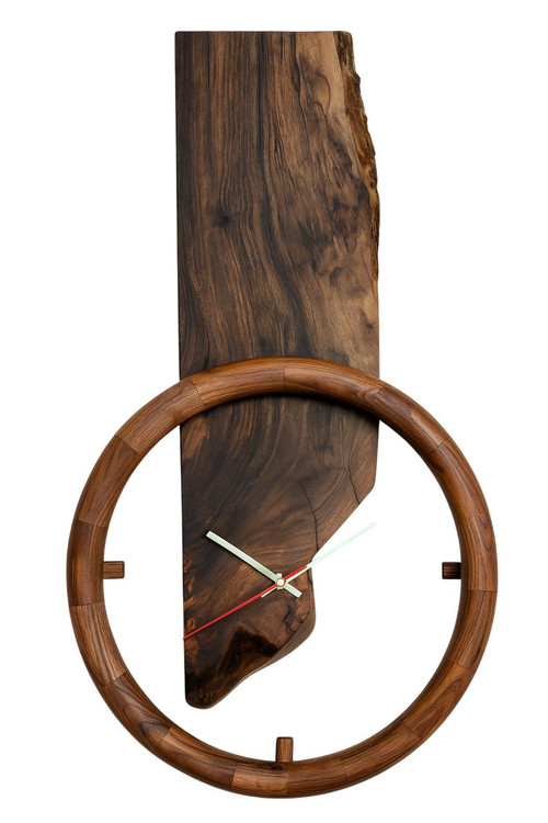 این ساعت دستساز از چوب گردوی سیاه کمیاب ساخته شده؛ حلقهای لولشده با قطر 40 سانت و صفحهای مستحکم به طول 60 سانت، پهنای 30 و ضخامت 4 سانت.