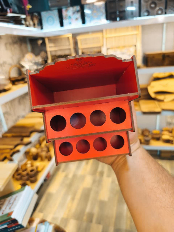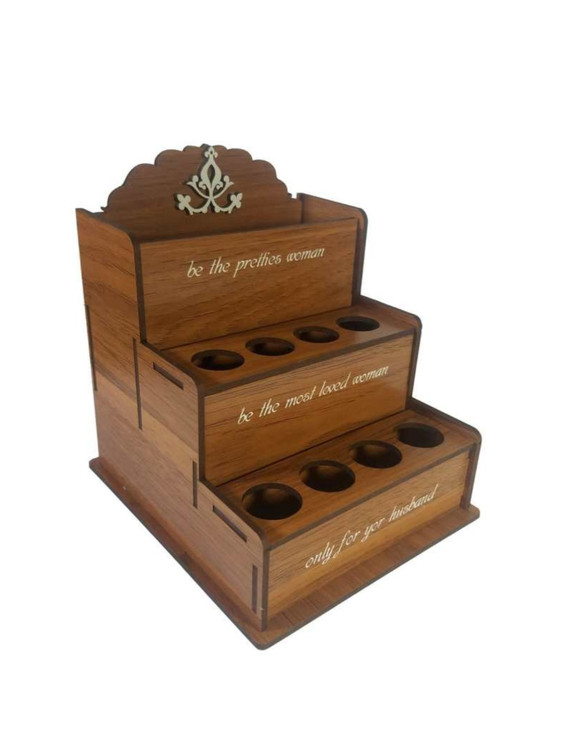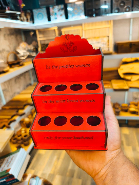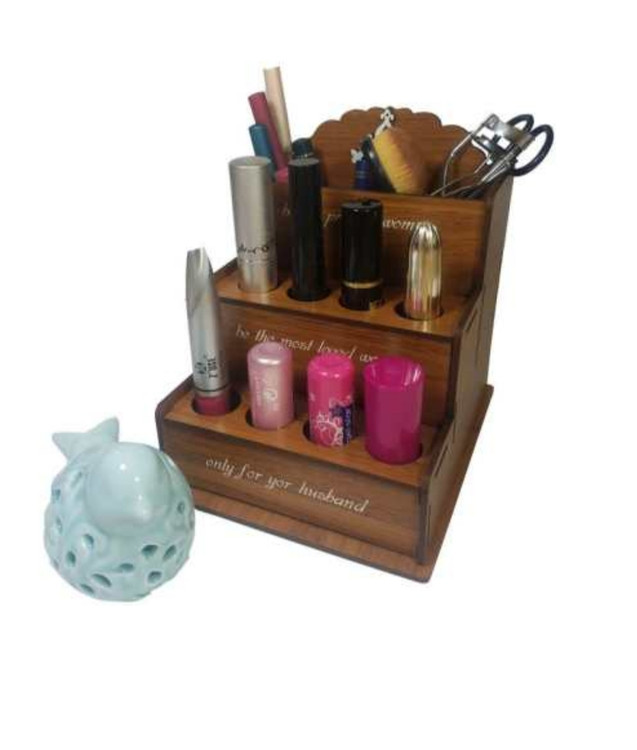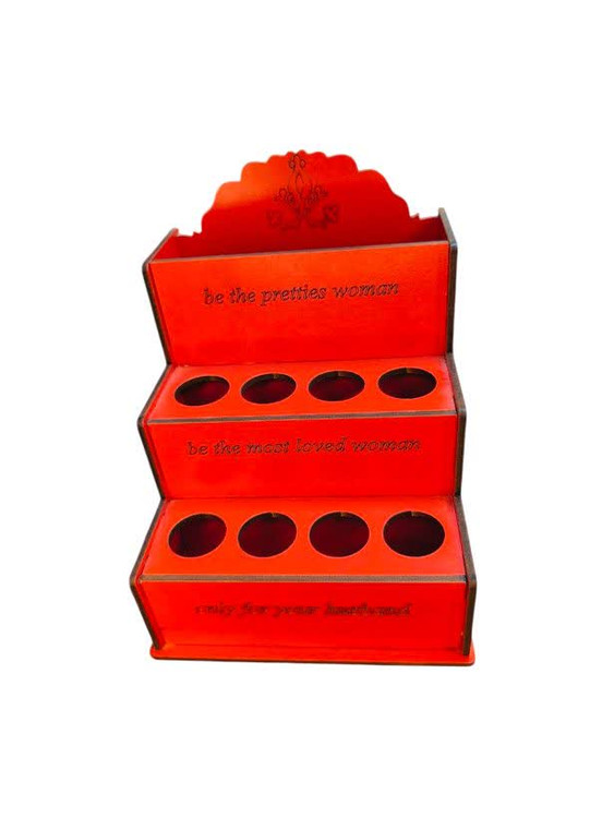 استند لوازم آرایشی بهداشتی با جنس ام دی اف 3 میل با هشت حفره که 4 عدد از حفره ها با قطر 23 میل ویژه ماتیک و شیشه های عطر بوده و 4 عدد از حفره ها که در طبقه ی دوم می باشد با قطر 20 میل برای ریمل و لوازم بلند تر طراحی شدهاین کار دارای دو باکس جا مدادی مانند برای قرار گرفتن مداد ها ، قیچی ها و ... نیز می باشددر ضمن این کار را می توان به عنوان جا مدادی نیز مورد استفاده قرار داد.