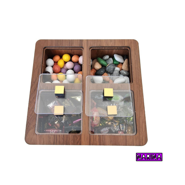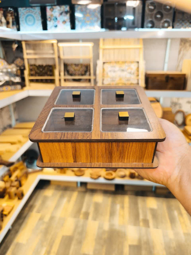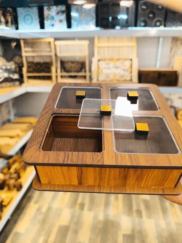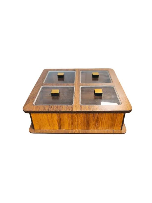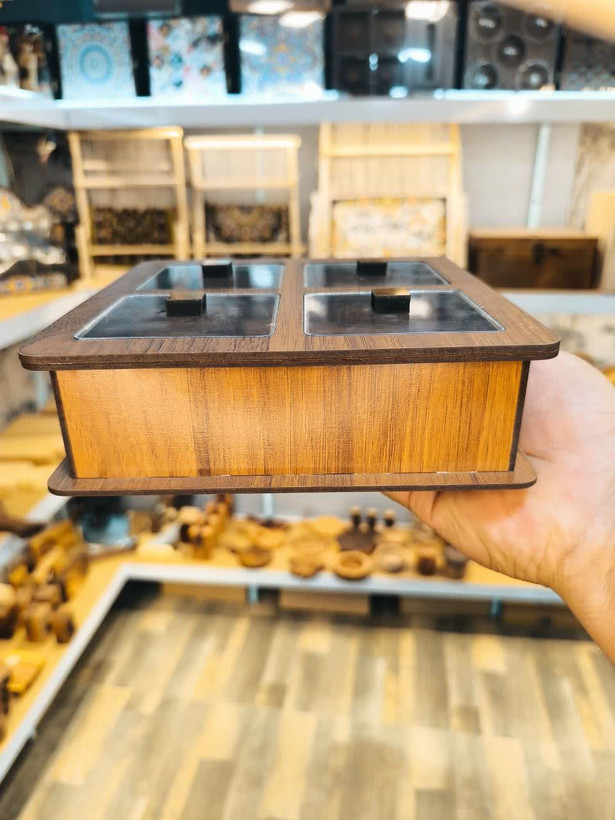 جعبه تی بگ چوبی۴خانه درب کریستال طرح چوبmdfتایوان